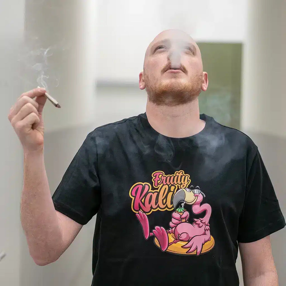 Das T-Shirt überzeugt mit einem kräftigen Schwarz und dem auffälligen Fruity Kali Motiv, das die Liebe zu hochwertigem CBD und Cannabis Lifestyle perfekt widerspiegelt. Hergestellt aus 100% Baumwolle, bietet es hohen Tragekomfort und Langlebigkeit. Zudem steht die faire Produktion für verantwortungsbewusste Mode.